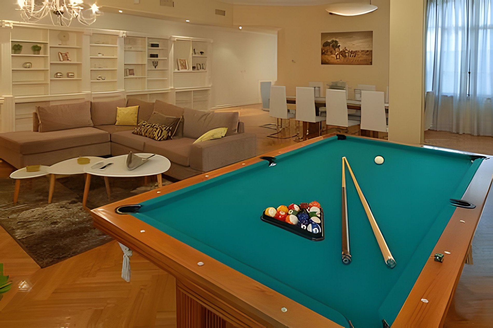 El living comedor, espacioso y luminoso, invita a disfrutar de momentos únicos en grupo o en familia. Su mesa de pool se convierte en un punto de encuentro perfecto, aportando un toque de distinción y entretenimiento.